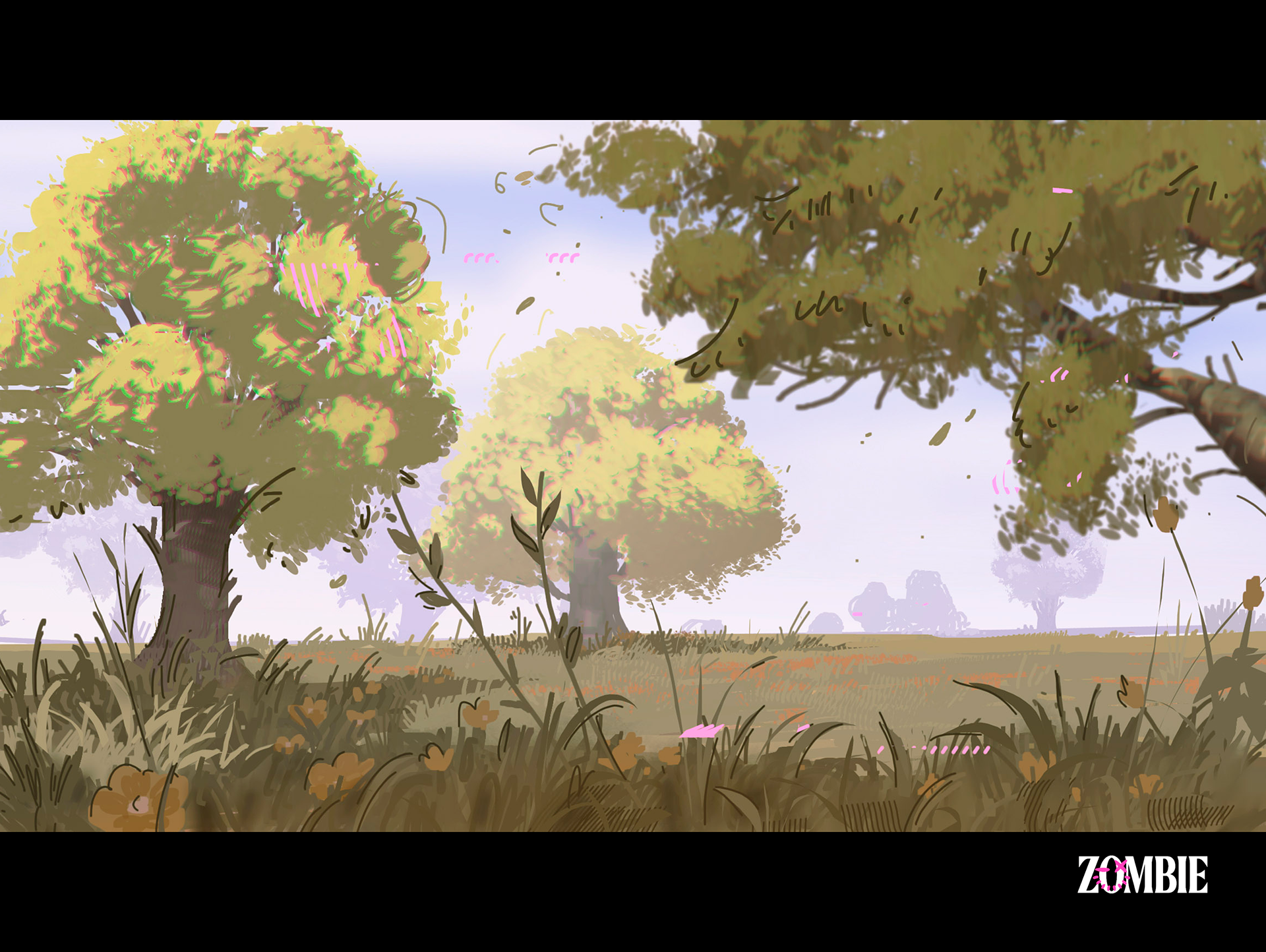 Todos os cenários do videoclipe, o color script e o visual foram desenvolvidos por mim, com minha direção de arte junto ao Zombie Studio, com direção do Paulo.